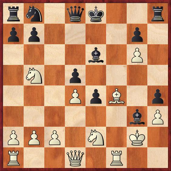 Compared to the positions where White plays 16. Bf4 immediately, the pawn trade on e4 has changed the position in two substantive ways. First, White is now adequately defending f4, so he doesn’t lose a piece. (But as the line above shows, that doesn’t matter!) Second, White has opened a diagonal for Black’s bishop, so there is a new defensive possibility: 17. … Bxh3+! 18. Kxh3 Qd7+ 19. Kg2 Qxb5. I was still not happy with this position, because the queen is rather out of play on b5 and Black still hasn’t finished developing the queenside pieces. But I thought I could survive.